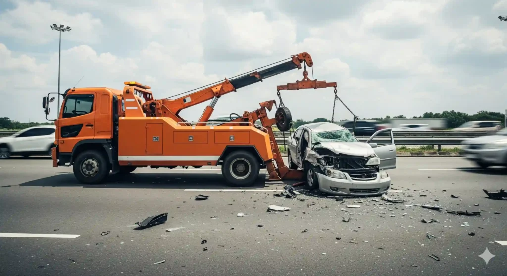 Layanan ini digunakan untuk mengangkut kendaraan yang terlibat kecelakaan. Kendaraan yang rusak parah, terguling, atau keluar jalur sering kali membutuhkan peralatan tambahan untuk mengembalikan posisi kendaraan sebelum dapat diderek.