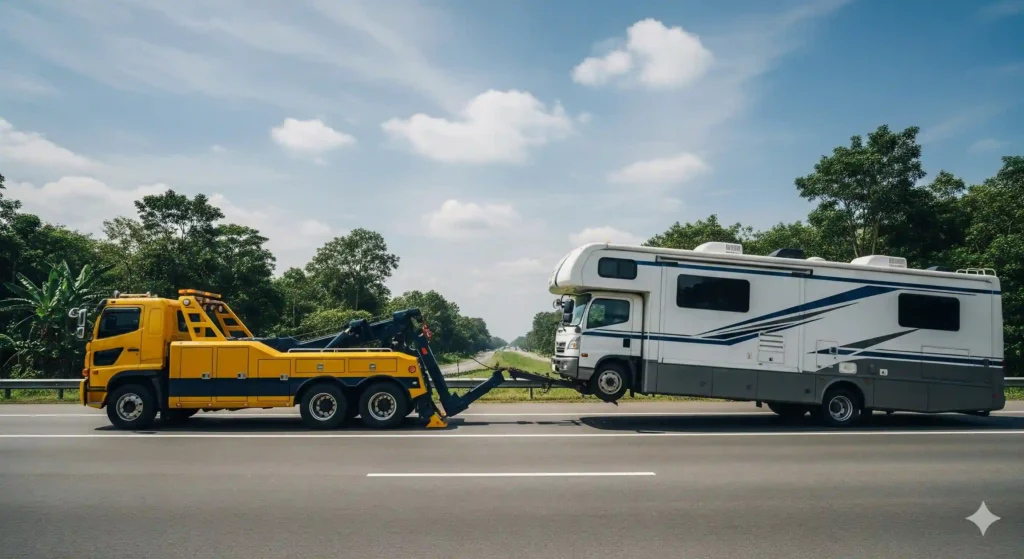 Truk derek berkapasitas besar diposisikan untuk menahan bobot motorhome atau RV.
