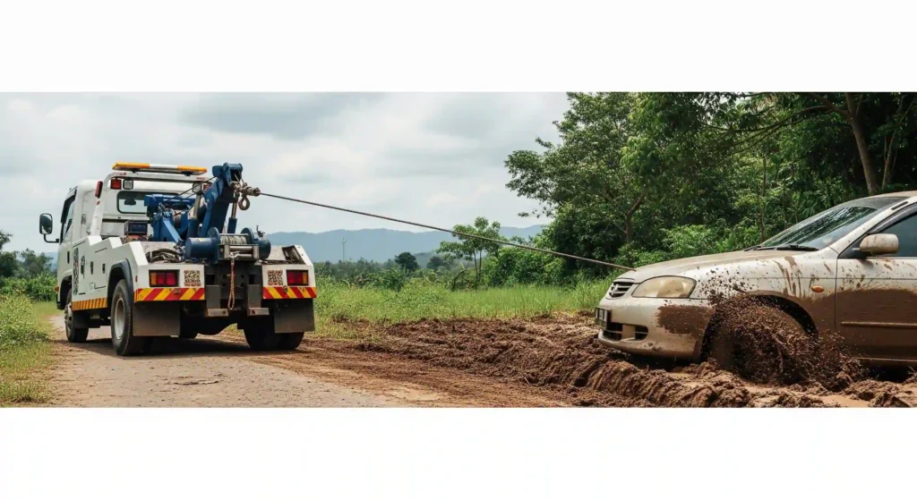 Kendaraan diposisikan untuk ditarik keluar dengan menggunakan winch yang terpasang pada truk derek.